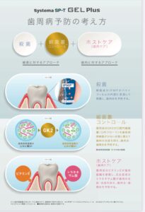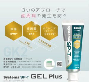 こんにちは! 歯科衛生士の浅川です。 今回はバージョンアップした 歯磨きジェル 《Systema SP-T ジェル Plus 》の ご紹介です!毎日のブラッシングで しっかり歯周病予防をしたい方に おすすめです! 3つの働きで 歯周病の発生を防いでくれる とっても頼もしい 歯みがき剤なんですよ。 【1】細菌叢コントロール 薬用成分GK2(グリチルリチン酸ジカリウム)が、 口の中の細菌バランス(口内フローラ)を整えます。 歯周病菌が増えにくい環境をつくり、 歯ぐきの炎症を抑えて 歯肉炎・歯周炎を予防します。 【2】殺菌作用 IPMP(イソプロピルメチルフェノール)が、 歯周病菌を含むバイオフィルムの奥まで しっかり浸透して殺菌します。 薬用歯みがきの基準で定められた 最大濃度で配合されています。 【3】ホストケア(歯ぐきケア) ビタミンE(酢酸トコフェロール)が 歯ぐきの防御力を高め、 原因菌が入り込むのを防ぎます。 さらにトラネキサム酸が、 炎症や出血を抑え、弱ってきた歯ぐきを やさしくケアします。 こちらもビタミンEが最大濃度で 配合されています。 そしてもちろんフッ素も配合! むし歯予防◎ フッ化ナトリウム(1450ppmF)配合で、 再石灰化を促進し、 むし歯の発生・進行を予防してくれます。 ジェルタイプの使いやすさ 粘り気のある高粘性ジェルが、 薬用成分を歯ぐきや 歯周ポケットに長くとどめます。 研磨剤無配合なので、 歯ぐきが弱っている部分も やさしく磨けます。